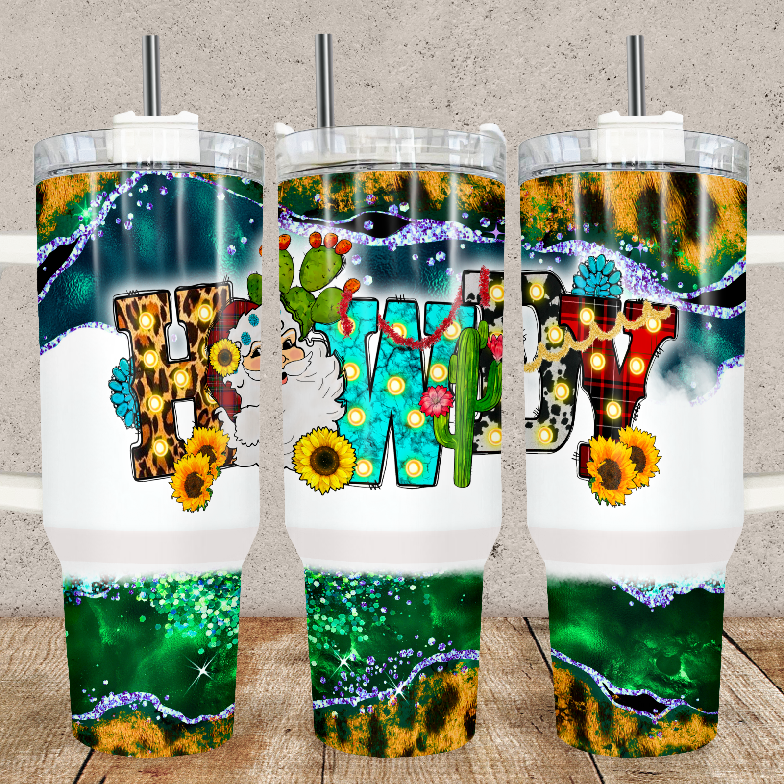Add a touch of Western charm to your holiday with our “Howdy” Christmas tumbler! This vibrant design combines rustic elements like sunflowers, cacti, and Santa, all set against a sparkling green backdrop. The unique lettering and colorful accents make this tumbler a fun way to say "Merry Christmas" with a country twist. Crafted from high-quality stainless steel, it keeps your beverages hot or cold for hours, perfect for cozy fireside sipping or holiday gatherings. Ideal for anyone who loves Western style, this tumbler makes a standout gift or a festive treat for yourself! 🤠🎄✨
