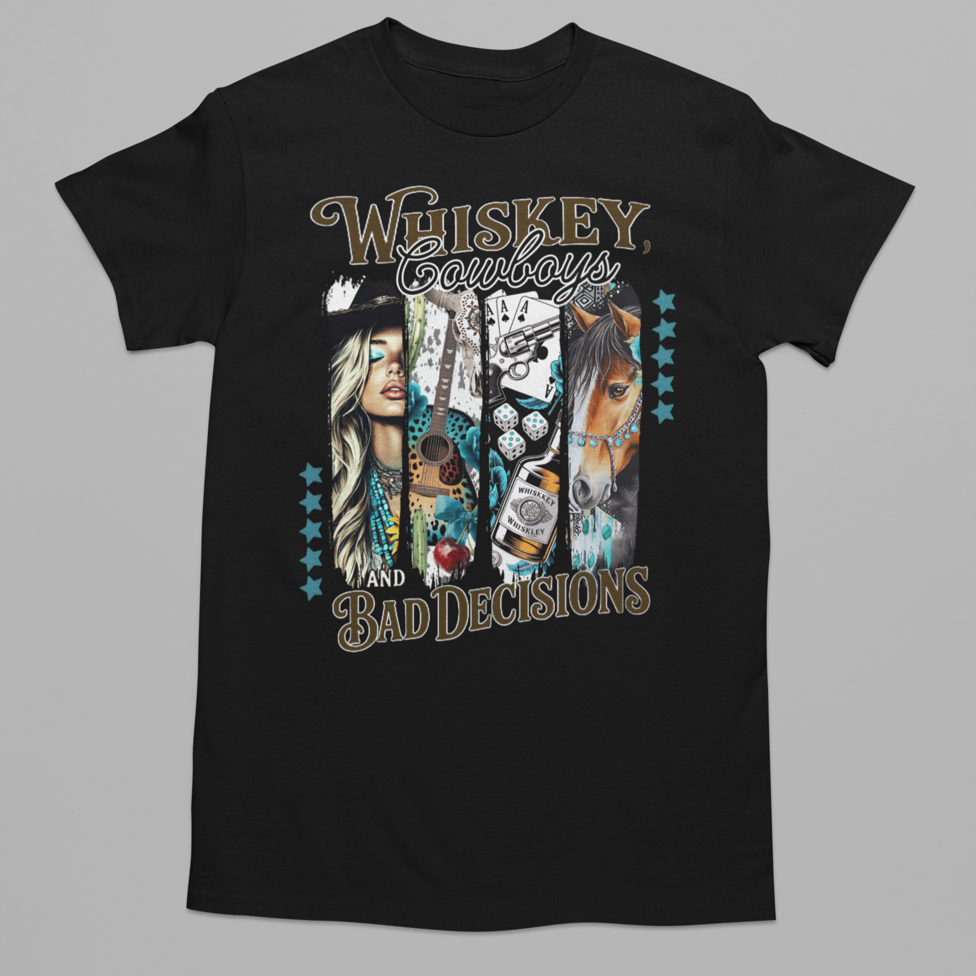 Unleash your wild side with the Whiskey & Bad Decisions Graphic Tee. Featuring cowboys, whiskey, and a hint of rebellious fun, this tee captures the spirit of adventure and bold choices. Perfect for those who embrace life with a fearless attitude and a touch of mischief.