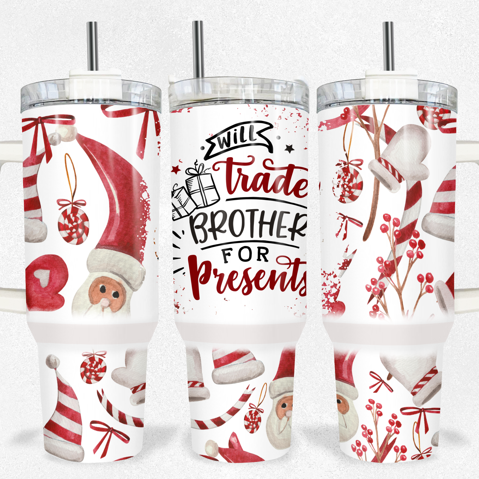 Bring some holiday laughs with our “Will Trade Brother for Presents” Christmas tumbler! Featuring playful designs of Santa hats, candy canes, and festive ornaments, this tumbler adds a cheeky twist to the season. Made from high-quality stainless steel, it keeps your drinks hot or cold for hours—perfect for those holiday road trips, shopping sprees, or cozying up at home. With its lighthearted vibe, this tumbler is a fun gift for friends or family or a humorous addition to your own Christmas collection. Because sometimes, presents are just worth it!