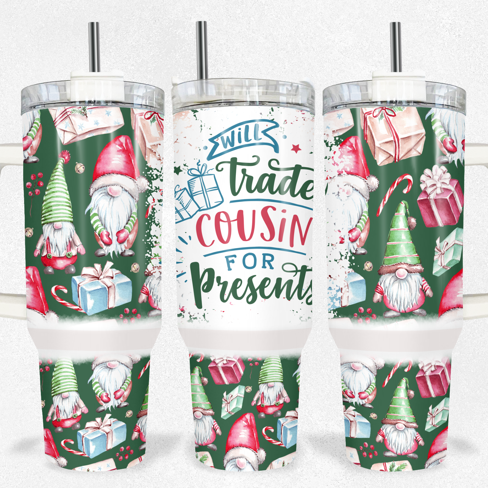 Add some holiday humor to your drinkware with our “Will Trade Cousin for Presents” Christmas tumbler! Adorned with adorable gnomes, festive gifts, and candy canes on a rich green background, this tumbler brings a playful touch to the season. Made from durable stainless steel, it keeps your drinks hot or cold for hours, making it perfect for sipping cocoa, coffee, or a holiday cocktail. Great as a lighthearted gift or a fun addition to your own collection, this tumbler is sure to bring laughs and holiday cheer. Because, let’s be honest—who wouldn’t make the trade? 🎁🌲
